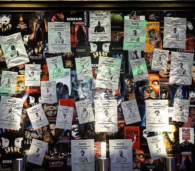 内部,一堆老式电视机在红色的灯光下闪烁,墙上贴满了“通缉令”海报